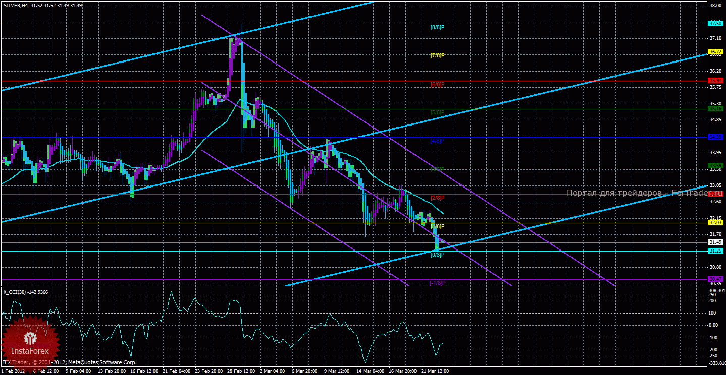 Исходя из анализа серебра 23 марта, видно, что курс продолжает сохранять перспективы дальнейшего снижения, курс скорректировался к мувингу, но выше него подняться не сумел. Старший канал направлен вверх, что свидетельствует о восходящем направлении движения глобального тренда. Младший канал направлен вниз, что означает нисходящее движение в менее долгосрочном плане. Сейчас цена находится ниже мувинга и ниже уровня Мюррея «1/8», что делает более вероятным нисходящее движение. Первой целью нисходящего движения является уровень Мюррея «0/8» — 31,25, который уже достигнут медведями, но пока не преодолен. В случае преодоления первого целевого уровня, нисходящее движение может продолжиться с целью «-1/8» — 30,47. Скользящая средняя направлена вниз, а цена в свою очередь находится ниже нее, что сигнализирует о текущем нисходящем направлении движения. Длинные позиции будут актуальны только после закрепления курса выше мувинга. Хайкен Аши окрасил последние бары в голубой цвет, что сигнализирует о локальном нисходящем движении и позволяет открывать и поддерживать сейчас шорты с обозначенными выше целями. Индикатор CCI находится около уровня -100, что свидетельствует о небольшой перепроданности курса серебра.