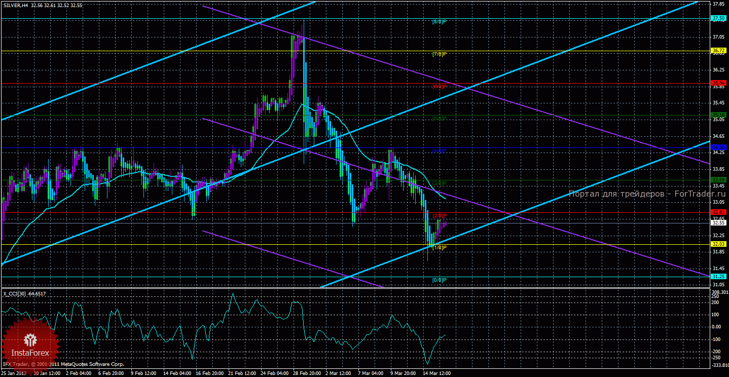 Исходя из анализа серебра 16 марта, видно, что курс продолжает сохранять перспективы дальнейшего снижения, а разворот младшего канала вниз позволяет заходить теперь в рынок с короткими позициями. Старший канал направлен вверх, что свидетельствует о восходящем направлении движения глобального тренда. Младший канал развернулся вниз, что означает нисходящее движение в менее долгосрочном плане. Сейчас цена находится ниже мувинга и ниже уровня Мюррея «2/8», что делает более вероятным нисходящее движение. Первой целью нисходящего движения является уровень Мюррея «1/8» — 32,03 и теперь отторговывать эту цель можно. В случае преодоления первого целевого уровня, нисходящее движение может продолжиться с целью «0/8» — 31,25. Скользящая средняя направлена вниз, а цена в свою очередь находится ниже нее, что сигнализирует о текущем нисходящем направлении движения. Длинные позиции будут актуальны после закрепления курса выше мувинга. Хайкен Аши окрасил последние бары в фиолетовый цвет, что сигнализирует о локальном восходящем движении и не является благоприятным фактором для открытия новых шортов. Индикатор CCI находится около уровня -100, что свидетельствует о наличие небольшой перепроданности курса серебра.