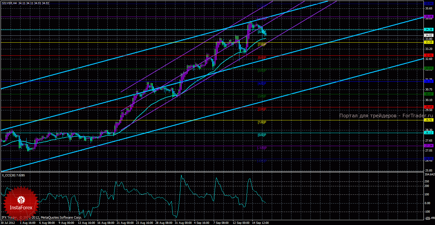 Исходя из анализа серебра 18 сентября, видно, что инструмент вслед за золотом начал корректироваться и достиг скользящую среднюю, ниже которой пока что не закрепился. Старший канал направлен наверх, что свидетельствует о восходящем направлении движения глобального тренда. Младший канал направлен наверх, что означает восходящее движение в менее долгосрочном плане. Сейчас цена находится выше мувинга и выше уровня Мюррея «7/8», что делает более вероятным продолжение восходящего движения. Первой целью восходящего движения является уровень Мюррея «8/8» — 34,38. В случае преодоления ценой этой отметки, новой целью для восходящего движения станет уровень Мюррея «+1/8» — 35,16. Скользящая средняя направлена вверх, а цена в свою очередь находится выше нее, что сигнализирует о текущем восходящем направлении движения. Короткие позиции можно будет вновь рассматривать, если развернется вниз один из каналов линейной регрессии и произойдет закрепление цены ниже мувинга. Хайкен Аши окрасил последние бары в голубой цвет, что сигнализирует о локальном нисходящем движении, поэтому ордера на покупку можно будет рассматривать после окончания коррекции, при условии нахождения цены выше мувинга. Индикатор CCI находится около нулевого уровня, что свидетельствует об отсутствии как перекупленности инструмента, так и перепроданности.
