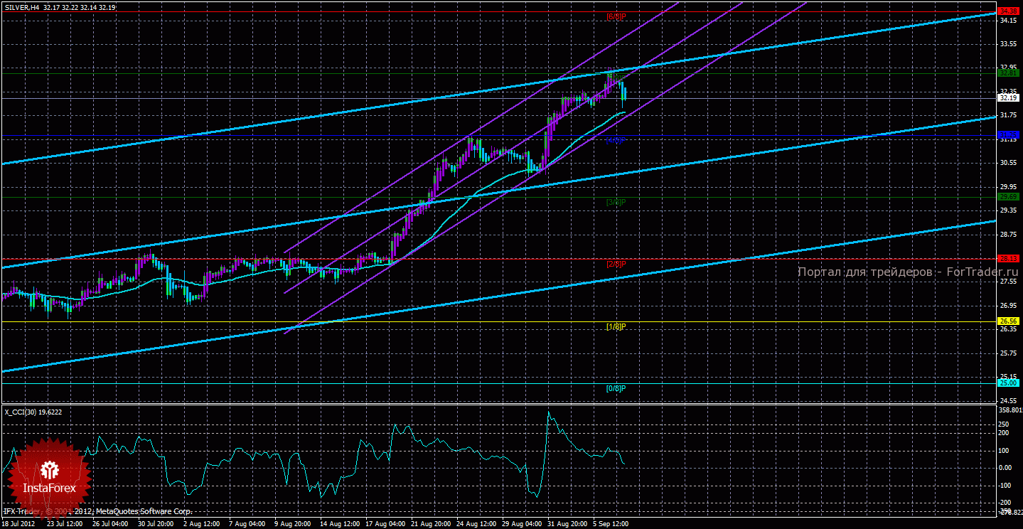 Исходя из анализа серебра 7 сентября, видно, что инструмент также начал корректироваться , о чем свидетельствуют голубые бары индикатора Хайкен Аши, но цена находится выше мувинга. Старший канал направлен наверх, что свидетельствует о восходящем направлении движения глобального тренда. Младший канал направлен наверх, что означает восходящее движение в менее долгосрочном плане. Сейчас цена находится выше мувинга и выше уровня Мюррея «4/8»(все уровни перерассчитались), что делает более вероятным продолжение восходящего движения. Первой целью восходящего движения является уровень Мюррея «5/8» — 32,81, который был достигнут и от которого началась коррекция. В случае преодоления ценой этой отметки, новой целью для восходящего движения станет уровень Мюррея «6/8» — 34,38. Скользящая средняя направлена вверх, а цена в свою очередь находится выше нее, что сигнализирует о текущем восходящем направлении движения. Короткие позиции можно будет вновь рассматривать, если развернется вниз один из каналов линейной регрессии и произойдет закрепление цены ниже мувинга. Хайкен Аши окрасил последние бары в голубой цвет, что сигнализирует о локальном нисходящем движении, поэтому ордера на покупку будут актуальны после окончания этой коррекции, которое можно будет идентифицировать по окрасу баров в фиолетовый цвет. Индикатор CCI находится около нулевого уровня, что свидетельствует об отсутствии как перекупленности, так и перепроданности инструмента.