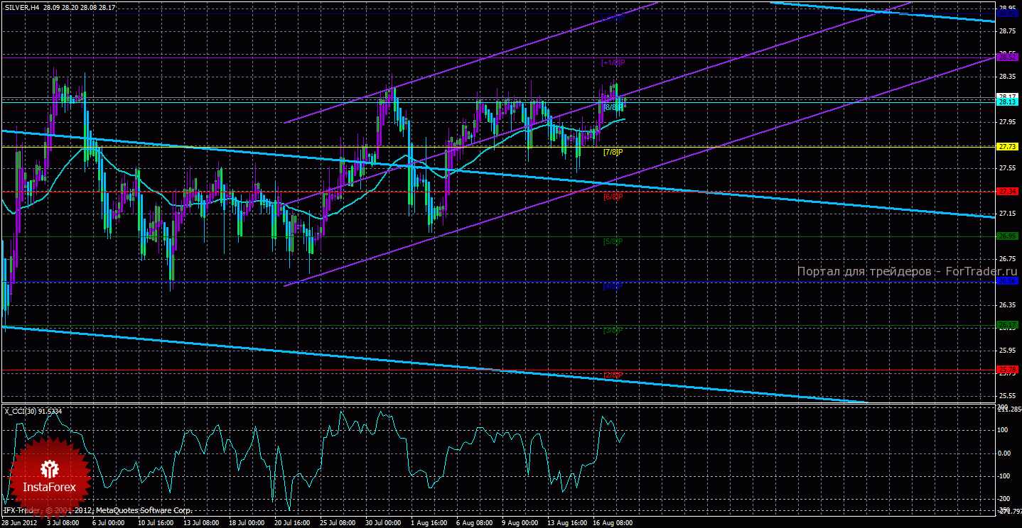 Исходя из анализа серебра 20 августа, видно, что цена, последовав примеру золота, также закрепилась выше скользящей средней, поэтому теперь актуальны длинные позиции на рынке. Старший канал направлен вниз, что свидетельствует о нисходящем направлении движения глобального тренда. Младший канал направлен наверх, что означает восходящее движение в менее долгосрочном плане. Сейчас цена находится выше мувинга и выше уровня Мюррея «8/8» (уровни Мюррея перерасчитались), что делает более вероятным продолжение восходящего движения. Первой целью восходящего движения является уровень Мюррея «5/8» — 28,52. Если курс серебра сумеет закрепиться выше этого уровня, то восходящее движение может продолжиться с целью «6/8» — 28,91. В случае отработки этого уровня, все уровни Мюррея могут вновь перерассчитаться. Скользящая средняя направлена вверх, а цена в свою очередь находится выше нее, что сигнализирует о текущем восходящем направлении движения. Короткие позиции можно будет вновь рассматривать, если цена закрепиться ниже мувинга. Хайкен Аши окрасил последние бары в голубой цвет, что сигнализирует о локальном нисходящем движении, а значит, что ордера на покупку пока не актуальны до образования 1-2 фиолетовых баров. Индикатор CCI находится около уровня 100, что свидетельствует о небольшой перекупленности инструмента.
