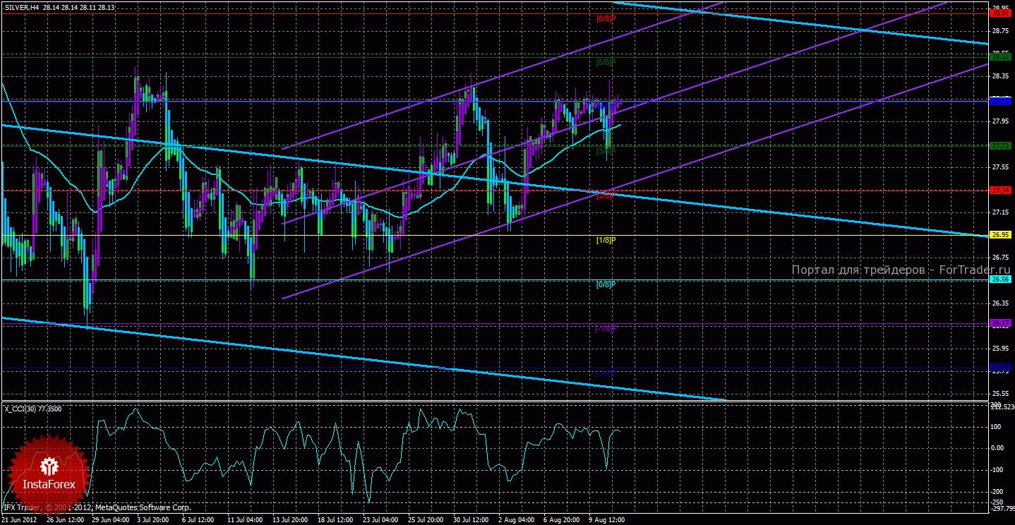 Исходя из анализа серебра 13 августа, видно, что цена также продолжает восходящее движение после попытки закрепиться ниже скользящей средней, которая ни к чему не привела. Старший канал направлен вниз, что свидетельствует о нисходящем направлении движения глобального тренда. Младший канал развернулся наверх, что означает восходящее движение в менее долгосрочном плане. Сейчас цена находится выше мувинга и выше уровня Мюррея «3/8», что делает более вероятным продолжение восходящего движения. Первой целью восходящего движения является уровень Мюррея «4/8» — 28,13, этот уровень уже был несколько раз достигнут, но так и не преодолен. Если курс серебра сумеет закрепиться выше этого уровня, то восходящее движение может продолжиться с целью «5/8» — 28,52. Скользящая средняя направлена вверх, а цена в свою очередь находится выше нее, что сигнализирует о текущем восходящем направлении движения. Короткие позиции можно вновь рассматривать, если цена закрепиться ниже мувинга. Хайкен Аши окрасил последние бары в фиолетовый цвет, что сигнализирует о локальном восходящем движении, а это значит, что ордера на покупку актуальны сейчас. Индикатор CCI находится около уровня 100, что свидетельствует о небольшой перекупленности инструмента.