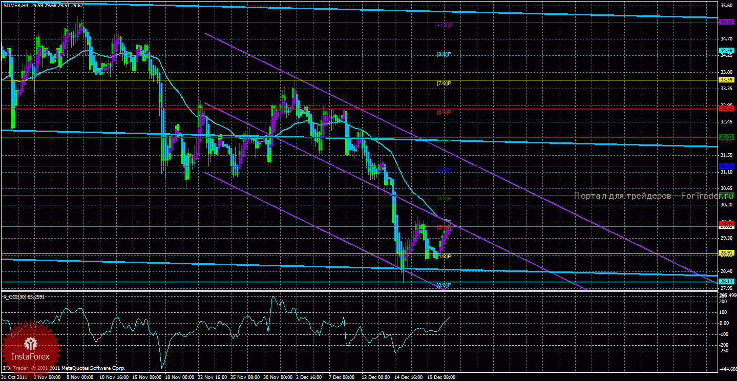 Исходя из анализа серебра 21 декабря видно, что курс серебра, также как и курс золота, продолжает расти, однако выше скользящей средней пока что не закрепился. Старший канал направлен вбок, что свидетельствует о боковом направлении движения глобального тренда, однако это вряд ли означает разворот канала наверх. Младший канал направлен вниз, что означает нисходящее движение в менее долгосрочном плане. Сейчас цена находится ниже мувинга и ниже уровня Мюррея «2/8», поэтому отторговывать текущее движение можно. Первой целью нисходящего движения является уровень Мюррея «1/8» — 28,91, который цена уже достигала. В случае преодоления первого целевого уровня, нисходящее движение продолжиться с целью «0/8» — 28,13. Скользящая средняя направлена вбок, а цена в свою очередь находится ниже нее, что сигнализирует о текущем нисходящем движении. Рассматривать торговлю на повышение можно будет не ранее разворота одного из каналов линейной регрессии наверх и закрепления курса выше мувинга. Хайкен Аши окрасил несколько баров в фиолетовый цвет, что сигнализирует о локальном восходящем движении, что не позволяет сейчас открывать шорты, открывать же шорты можно будет в случае разворота этого индикатора вниз. Индикатор CCI находится около уровня 100, что свидетельствует о наличии небольшой перекупленности курса серебра.