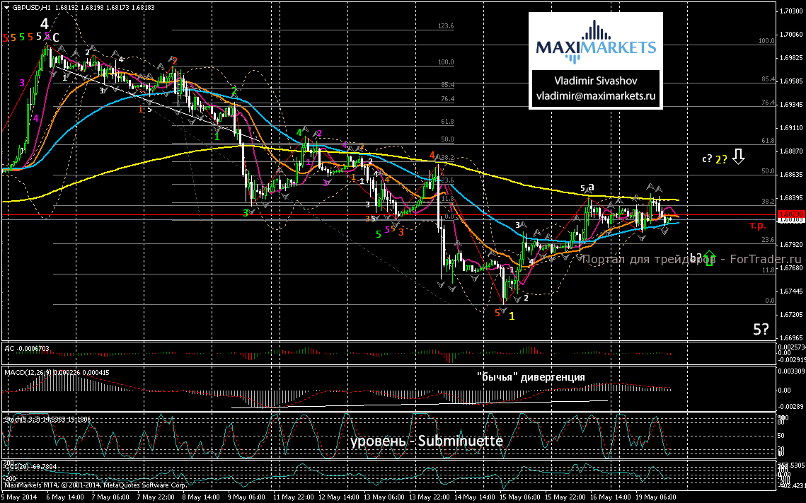 В нашем прогнозе на сегодня предполагаем завершение текущей восходящей коррекции в ценовой зоне 1.6860 ÷ 1.6890, а затем возобновление нисходящего движения британской валюты к целевым уровням 1.68, 1.6782, 1.6758 и, возможно, ниже, к ценовому уровню 1.6731.
