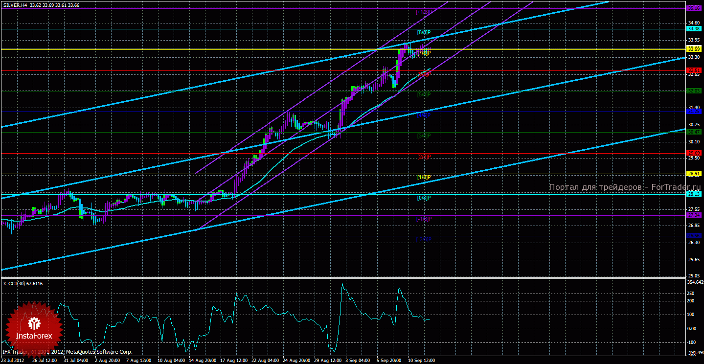 Исходя из анализа серебра 12 сентября, видно, что инструмент, немного скорректировавшись, возобновил восходящее движение, довольно сильное и продолжительное. Старший канал направлен наверх, что свидетельствует о восходящем направлении движения глобального тренда. Младший канал направлен наверх, что означает восходящее движение в менее долгосрочном плане. Сейчас цена находится выше мувинга и выше уровня Мюррея «6/8»(все уровни перерассчитались), что делает более вероятным продолжение восходящего движения. Первой целью восходящего движения является уровень Мюррея «7/8» — 33,59, который уже был отработан, но не преодолен. В случае преодоления ценой этой отметки, новой целью для восходящего движения станет уровень Мюррея «8/8» — 34,38. Скользящая средняя направлена вверх, а цена в свою очередь находится выше нее, что сигнализирует о текущем восходящем направлении движения. Короткие позиции можно будет вновь рассматривать, если развернется вниз один из каналов линейной регрессии и произойдет закрепление цены ниже мувинга. Хайкен Аши окрасил последние бары в голубой цвет, что сигнализирует о локальном нисходящем движении, поэтому ордера на покупку можно будет рассматривать после окончания текущей коррекции(которая, возможно, уже завершилась), которое можно будет идентифицировать по окрасу баров в фиолетовый цвет. Индикатор CCI находится около уровня 100, что свидетельствует о небольшой перекупленности инструмента.