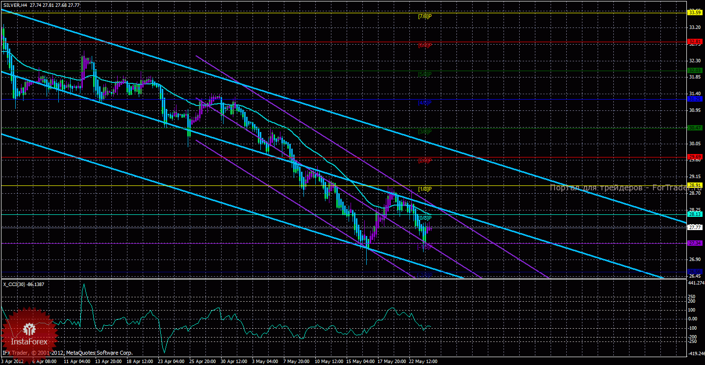 Исходя из анализа серебра 24 мая, видно, что цена возобновила нисходящее движение, однако, отработав уровень Мюррея «-1/8», Хайкен Аши предупреждает о возможном начале новой коррекции. Старший канал направлен вниз, что свидетельствует о нисходящем направлении движения глобального тренда. Младший канал направлен вниз, что означает нисходящее движение и в менее долгосрочном плане. Сейчас цена находится ниже мувинга и ниже уровня Мюррея «0/8», что делает более вероятным продолжение нисходящего движения. Первой целью нисходящего движения является уровень Мюррея «-1/8» — 27,34, этот уровень уже был отработан ценой. Если курс серебра сумеет закрепиться ниже этого уровня, то продажи можно будет продолжать с целью «-2/8» — 26,56. По достижении и преодолении этого уровня все уровни Мюррея перерисуются и будут образованы новые уровни. Скользящая средняя направлена вниз, а цена в свою очередь находится ниже нее, что сигнализирует о текущем нисходящем направлении движения. Длинные позиции будут вновь актуальны только после закрепления курса выше мувинга и разворота одного из каналов регрессии наверх. Хайкен Аши окрасил последние бары в фиолетовый цвет, что сигнализирует о локальном восходящем движении, поэтому до разворота Хайкен Аши вниз открывать новые ордера на продажу не рекомендуется. Индикатор CCI находится около уровня -100, что свидетельствует о слабой перепроданности инструмента.