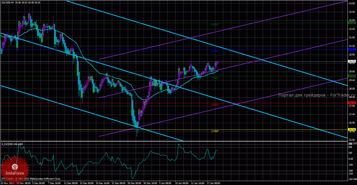 Исходя из анализа серебра 19 января видно, что курс продолжает находится в восходящем тренде и, следовательно, актуальны длинные позиции, также как и по золоту, курс часто корректируется к мувингу. Старший канал направлен вниз, что свидетельствует о нисходящем направлении движения глобального тренда. Младший канал направлен вверх, что означает восходящее движение в менее долгосрочном плане. Сейчас цена находится выше мувинга и выше уровня Мюррея «3/8», что делает актуальным восходящее движение. Первой целью восходящего движения является уровень Мюррея «4/8» — 31,25, и торговать на повышение с этой целью можно. В случае преодоления первого целевого уровня, восходящее движение продолжиться с целью «5/8» — 32,81. Скользящая средняя направлена вверх, а цена в свою очередь находится выше нее, что сигнализирует о текущем восходящем движении. Короткие позиции можно будет рассматривать только после закрепления цены ниже мувинга. Хайкен Аши окрасил несколько баров в фиолетовый цвет, что сигнализирует о возобновлении локального восходящего движения, поэтому сейчас ордера на покупку открывать можно, как и поддерживать уже открытые позиции. Индикатор CCI находится около уровня 100, что свидетельствует о небольшой перекупленности курса серебра.