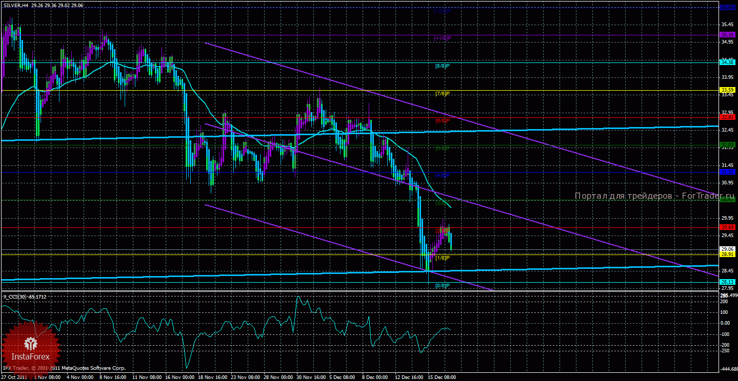 Исходя из анализа серебра 19 декабря видно, что курс серебра, также как и курс золота, скорректировался после достигнутого локального минимума 28,13, но на данный момент вполне вероятно, что коррекция завершена. Старший канал направлен вбок, что свидетельствует о боковом направлении движения глобального тренда, однако это вряд ли означает разворот канала наверх. Младший канал направлен вниз, что означает нисходящее движение в менее долгосрочном плане. Сейчас цена находится ниже мувинга и ниже уровня Мюррея «2/8», поэтому отторговывать текущее движение можно. Первой целью нисходящего движения является уровень Мюррея «1/8» — 28,91, который цена уже достигла. В случае преодоления первого целевого уровня, нисходящее движение продолжиться с целью «0/8» — 28,13. Из-за достижения уровня Мюррея «-2/8», все уровни перерисовались и торговля ведется уже по новым уровням. Скользящая средняя направлена вниз, а цена в свою очередь находится ниже нее, что сигнализирует о текущем нисходящем движении. Рассматривать торговлю на повышение можно будет не ранее разворота одного из каналов линейной регрессии наверх и закрепления курса выше мувинга. Хайкен Аши окрасил несколько баров в голубой цвет, что сигнализирует о локальном нисходящем движении, что позволяет сейчас открывать шорты, выходить же из рынка можно будет после разворота этого индикатора наверх, что будет означать коррекцию или откат. Индикатор CCI находится около уровня -100, что свидетельствует о наличии небольшой перепроданности курса серебра.