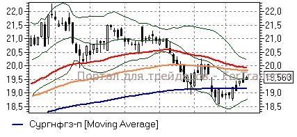 Сургутнефтегаз ап (+1,05%) – акции сегодня торгуются выше средней полосы Боллинжера дневного графика (19,5 руб), но при этом находятся ниже последних важных сопротивлений в виде «долгих» скользящих средних, которые сдерживают их рост (19,8-19,9 руб). Технические индикаторы в целом не препятствуют развитию повышения, однако, стоит внимательно следить за способностью бумаг устоять выше 19,5 руб – пробитие данного значения может привести к падению как минимум в район 19,15 руб (линия EMA200).