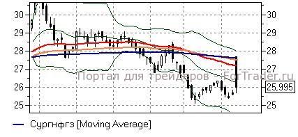 Сургутнефтегаз ао (+1,3%) – акции сегодня поднимались в район «долгих» скользящих средних дневного графика (27,3-27,6 руб), однако, быстро вернулись к вчерашним значениям, опустившись также ниже средней полосы Боллинжера (26,4 руб). Технические индикаторы дают умеренно оптимистичные сигналы, не исключая развития восходящего движения и возвращения бумаг к сегодняшним максимумам. «Быкам», однако, стоит проявить осторожность и открывать новые позиции лишь в случае закрепления акций выше 26,4 руб.