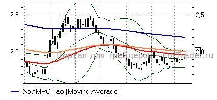 Холдинг МРСК (+5,47%) – акции сегодня торгуются выше средней полосы Боллинжера и линии EMA55 дневного графика (1,91-1,96 руб), при этом ближайшим важным сопротивлением на их пути выступает линия EMA100 (2,01 руб). Лишь при её пробитии можно ожидать развития повышения в район предыдущих локальных максимумов (2,09 руб), чему в целом не противоречат технические индикаторы, которые предупреждают также и о том, что спешить с открытием новых «длинных» позиций до закрепления выше сопротивления не стоит – силы «быков» ещё не столь велики.