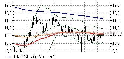 ММК (+0,82%) – акции вчера удержались выше средней полосы Боллинжера дневного графика (10,46 руб) и сегодня тестируют на прочность линии EMA55,EMA100 (10,6 руб), при пробитии которых можно будет рассчитывать на повышение в район верхней полосы Боллинжера (10,9 руб). Технические индикаторы дают умеренно положительные сигналы и не противоречат развитию повышения. «Быкам» вблизи важных сопротивлений, однако, не стоит забывать об осторожности.