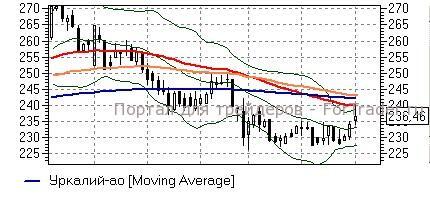 Уралкалий (+0,79%) – акции по итогам прошлой недели закрепились выше средней полосы Боллинжера дневного графика (233,4 руб) и сегодня поднялись к верхней, в район 239 руб, о возможности чего нами предупреждалось ранее. Бумаги также находятся недалеко от «долгих» скользящих средних (240-243 руб), которые вполне могут стать ближайшими целями их движения – технические индикаторы не исключают развития роста к указанным отметкам. Способность бумаг закрепиться выше, однако, стоит под вопросом – на данный момент лучше воздержаться от открытия новых «длинных» позиций, но сохранять уже имеющиеся.