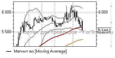 Магнит (-2,29%) – акции сегодня пытались развить отскок от локальных минимумов, однако, возобновили снижение и по-прежнему расположены ниже средней полосы Боллинжера дневного графика (5830 руб), до закрепления выше которой не стоит рассчитывать на возвращение к годовым максимумам. Технические индикаторы, с одной стороны, не исключают развития положительного сценария, а с другой указывают на доминирование «медведей» на рынке – с открытием «длинных» позиций не стоит спешить.