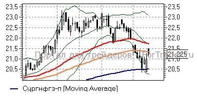 Сургутнефтегаз ап (+1,03%) – акции сегодня достигли обозначенной нами в начале недели цели роста в виде линии EMA100 дневного графика (21,35 руб), при закреплении выше которой имеют хорошие шансы продолжить повышение как минимум к отметке 21,7 руб (линия EMA55 и средняя полоса Боллинжера). Технические индикаторы дают положительные сигналы, не исключая развития роста бумаг, однако, открывать новые «длинные» позиции стоит не ранее закрепления выше 21,7 руб ввиду опасности отскока от важного сопротивления.