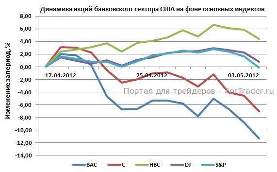 На прошлой неделе, фондовый рынок США отметился падением. Так, индекс S&P снизился на 2,71%, индекс Dow Jones — на 1,73%. Негативное влияние на рынок в начале прошлой недели оказали данные Министерства торговли США, согласно которым объем потребительских расходов в марте 2012 года вырос лишь на 0,3%, тогда как прогноз составлял 0,4%. Также, на настроения инвесторов существенно повлияли данные Министерства труда США, согласно которым число рабочих мест в несельскохозяйственном секторе в марте 2012 г. возросло на 115 тыс. Фактические данные оказались хуже прогнозов аналитиков, ожидавших прироста на 170 тыс. мест. Также участников фондового рынка не смогли убедить даже данные о том, что уровень безработицы в США в апреле 2012 г. снизился на 0,1% до 8,1%, хотя аналитики ожидали, что показатель не изменится и составит 8,2%.