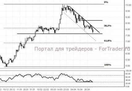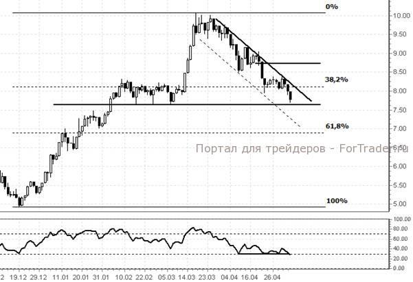 Рекомендуем продажу при пробое вниз уровня поддержки $7,66 за акцию. Цель — $7 за акцию. Покупка возможна в случае пробоя вверх линии сопротивления нисходящего канала с целью $8,70 за акцию.