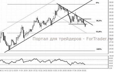 С точки зрения технического анализа, на прошлой неделе, график цены пробил вниз уровень поддержки $32,46. Причиной этому были, прежде всего, внешние факторы, связанные с негативной макростатистикой из США. Следующей целью графика цены становится ценовая отметка $30 (61,8% Fibo). Присоединиться к нисходящему тренду можно в случае отбоя от линии сопротивления нисходящего канала. Индикатор RSI находится в пределах зоны перепроданности. Длинные позиции возможны при условии пробоя вверх линии сопротивления.