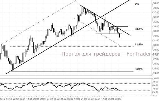 Рекомендуем продажу при пробое вниз уровня $32,46 за акцию. Цель — $30. Длинные позиции возможны при пробое вверх линии сопротивления нисходящего канала с последующей целью $35 за акцию.