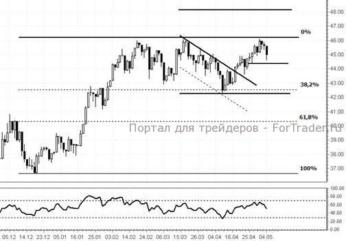 С точки зрения технического анализа, график цены продолжает находиться в пределах торгового коридора, образованного уровнями $42,40 и $46,12 за акцию. При пробое вверх уровня сопротивления $ 46,12 на фоне выхода вероятной умеренно позитивной отчетности, следующей целью будет отметка $48 за акцию. В случае, если финансовая отчетность окажется хуже прогнозов, возможен пробой вниз уровня поддержки $44,36 с последующим снижением до ценовой отметки $43 за акцию (38,2% Fibo).
