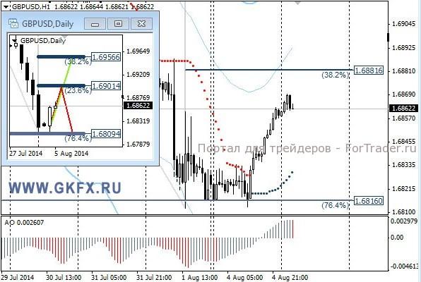 Пара GBPUSD отрабатывает намеченный сценарий и в районе 1,6880/1,6900 нужно понаблюдать за желанием роста далее или становится в продажи. Вчера была представлена статистика по строительному сектору Великобритании, которая оказалась сильной. Хотя на эти данные рынок обычно не реагирует, за неимением других поводов рынок среагировал на эти данные. На эту неделю традиционно рассматриваю два варианта возможного движения цены, основной красный и альтернативный зеленый. Значимые уровни на сегодня отмечены на часовом графике. Индикатор АО находится в положительной зоне и снижается, указывая на коррекцию перед возможным продолжением роста. Индикатор тренда указывает на рост. Вне рынка.