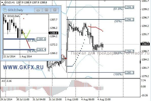 Цены на золото оправдывают ожидания и продолжают умеренное снижение. Сегодня доллар может получить поддержку на данных по сектору услуг в США. В случае сильных данных по США цены на золото могут продолжить снижаться, в противном случае текущая коррекция выше 1286,0 затянется. Также на золото могут оказать влияние геополитические новости. Традиционно делаю два варианта движения цены на неделю, основной красный и альтернативный зеленый. Значимые уровни на сегодня отмечены на часовом графике. Индикатор АО находится в отрицательной зоне и растет, указывая на коррекцию перед возможным продолжением снижения. Индикатор тренда указывает на снижение. Преодоление 1286,0 позволит продать с целями 1281,0, 1275,0 и 1270,0.