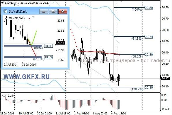 Цены на серебро продолжили умеренно снижаться, обновив минимумы за полтора месяца. Преодоление поддержки 20,10 даст возможность ценам продолжить снижение. Традиционно делаю два варианта движения цены на неделю, основной красный и альтернативный зеленый. Значимые уровни на сегодня отмечены на часовом графике. Индикатор АО находится в отрицательной зоне и растет, указывая на коррекцию перед возможным продолжением снижения. Индикатор тренда указывает на снижение. Преодоление 20,10 позволит продать с целями 19,97, 19,85 и 19,75.