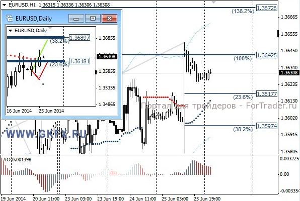 Пара EURUSD вновь совершала рывок наверх, выполнив условие по рекомендации на покупку. Войти было сложно, так как движение вверх было агрессивное. Вход можно было совершить выше 1,3630, а первая цель находилась и была достигнута на 1,3640. Стоп можно было перевести на уровень безубытка, в итоге он и сработал. Движение пары вверх произошло на уточненных данных по ВВП США за первый квартал, которые оказались намного хуже предыдущей оценки. Сегодня вновь ожидается статистика по США, поэтому основное движение можно ожидать во второй половине дня. На эту неделю традиционно рассматриваю два варианта возможного движения цены, основной красный и альтернативный зеленый. Значимые уровни на сегодня отмечены на часовом графике. Индикатор АО находится в положительной зоне и снижается, указывая на коррекцию перед возможным продолжением роста. Индикатор тренда указывает на рост. Покупки из района 1,3630/20 с целями 1,3640 и 1,3670. Стоп под 1,3615.