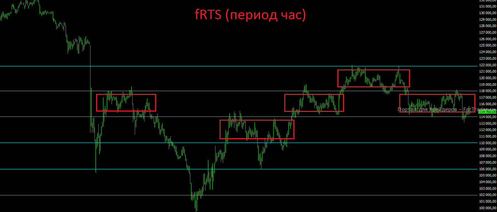 Фьючерс на индекс РТС уже вторую неделю консолидируется в чётком диапазоне с границами 114000-118000 пунктов. В понедельник цена сумела вновь отскочить от верхней границы и проколоть нижнюю, но закрытие дня произошло внутри диапазона. Шансов на пробой нижней границы сейчас всё же больше, и если это случится, то движение вниз продолжится как минимум до отметки 110000 пунктов. Сегодня пройдёт месячная экспирация, поэтому шансы на выход к отметке 115000 пока сохраняются.