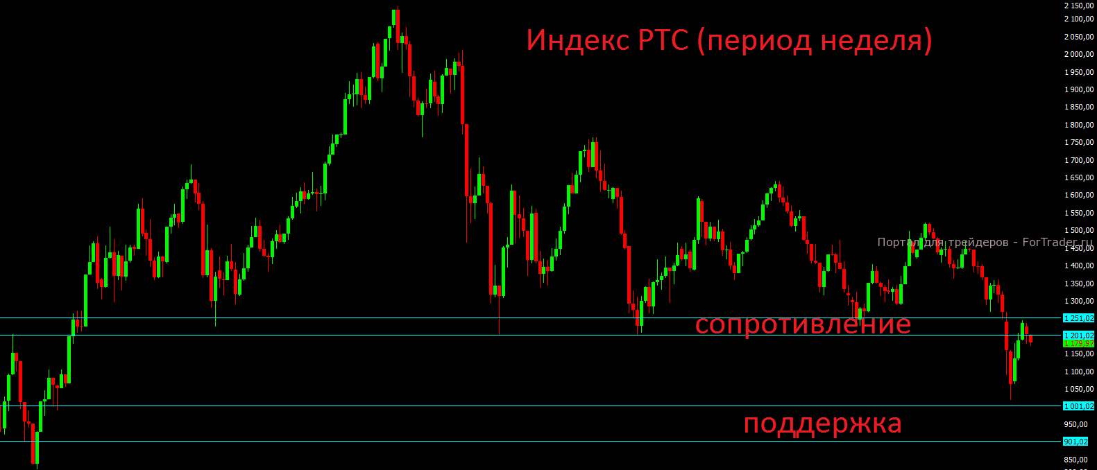На недельном графике индекса РТС цена вновь опустилась ниже важного уровня сопротивления 1200-1250 пунктов.