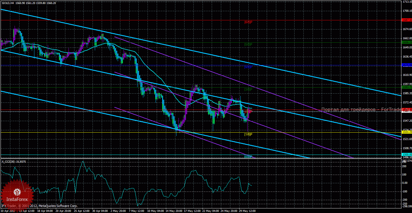 Исходя из картины, сложившейся по золоту 31 мая, видно, что курс в третий раз достиг уровень Мюррея 1531,25 и вновь не смог его преодолеть, отскочив обратно к скользящей средней. Старший канал направлен вниз, что свидетельствует о нисходящем направлении движения глобального тренда. Младший канал также направлен вниз, что означает нисходящее направление движения и в среднесрочном плане. На данный момент цена находится ниже мувинга и ниже уровня Мюррея «2/8», что говорит нам о нисходящем направлении движения в ближайшей перспективе. Первой целью нисходящего движения, таким образом, вновь является уровень Мюррея «1/8» — 1531,25, который уже не один раз был достигнут, но не преодолен. В случае преодоления ценой этого уровня, следующей целью будет выступать уровень «0/8» — 1500,00. Скользящая средняя направлена вбок, а цена находится ниже нее, поэтому сейчас более вероятно нисходящее движение в ближайшие дни. Хайкен Аши окрасил несколько баров в фиолетовый цвет, что сигнализирует о текущем восходящем движении, поэтому до разворота этого индикатора обратно вниз, открывать короткие позиции — рано. Длинные позиции станут актуальными после закрепления цены выше мувинга и разворота одного из каналов наверх. Индикатор CCI находится около уровня 0, что говорит об отсутствии какой-либо перекупленности или перепроданности инструмента.
