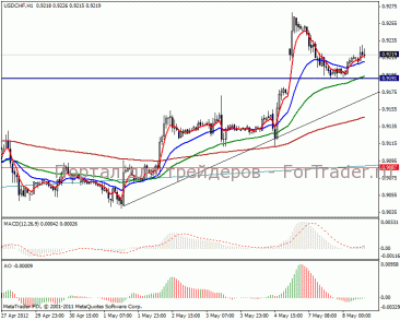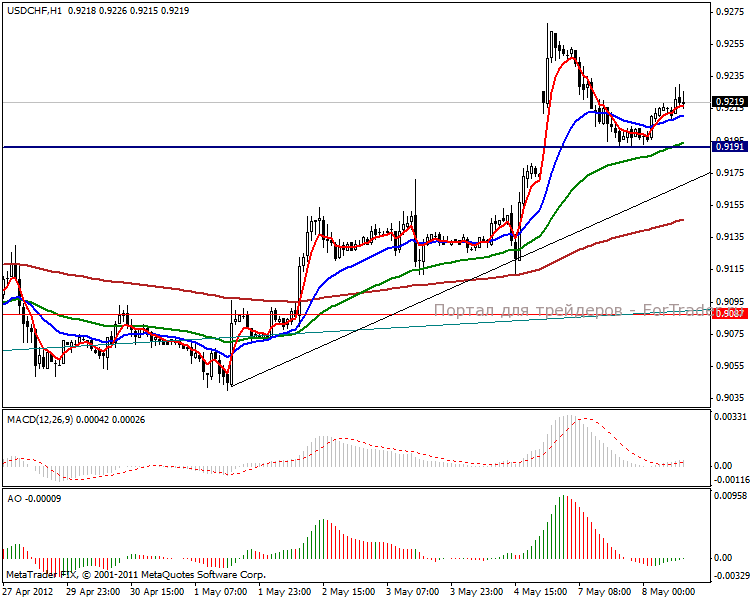 Часовой график вырисовывает локальный восходящий тренд, цена закрепилась на уровне поддержки в 0.9191 пунктов, а веер МА указывает на дальнейшее растущее движение. Краткосрочная перспектива заключается в незначительном боковике, но в лонг входить можно.