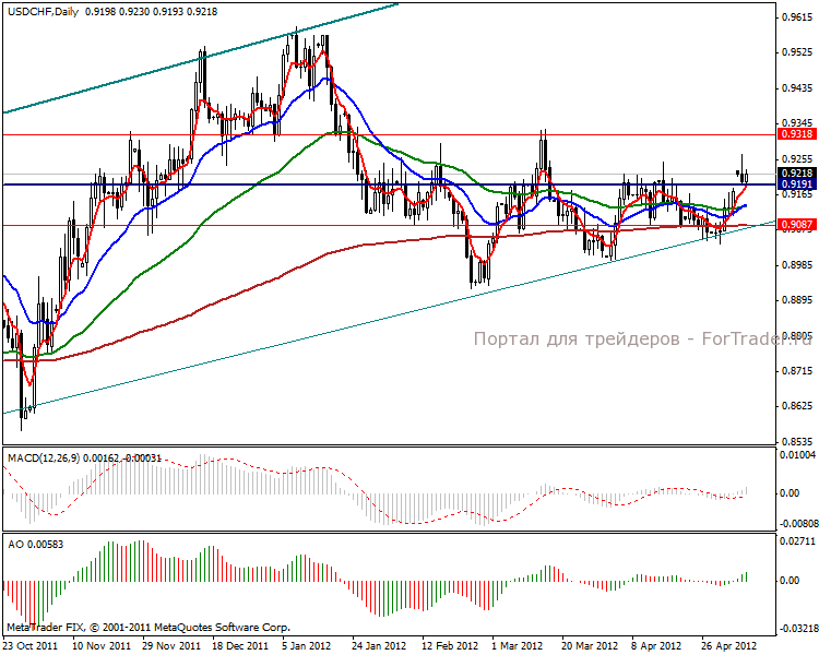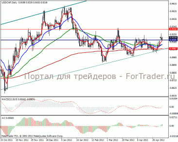 Дневной график показывает среднесрочные цели в локальных верхах 0.9566-0.9600 пунктов. Тренд достаточно сильный, чтобы ускорить взятие выше указанных отметок, но изначально возьмем сопротивление 0.9318 пунктов. Индикаторы говорят об ослаблении активности движения валютной пары, поэтому направление будет без существенных коррекций.