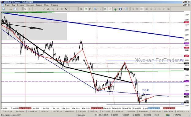 На американском фондовом рынке снижение, снижение и ничего кроме снижения. В принципе, это единственная формулировка состояния расчётных уровней основного индекса американского рынка акций, уже более 7 недель. Причин для снижения достаточно в тех выводах, которые уже в начале обзора я попробовал выразить. Естественно лето далеко не то время, когда стоит активно скупать акции эмитентов, на фоне замедления экономических показателей и неизвестности относительно реакции рынков на факт завершения программы QE2 и финансовых проблем Греции, решение по которым ожидается в понедельник следующей недели. Не стоит покупать акции эмитентов и по причине отсутствия факторов роста сырьевых и товарных рынков, слабо компенсировавших своё падение в мае. Ну, а в пользу ещё большего снижения до конца июля, как минимум, указывает и падение расчётных уровней индекса Dow Jones ниже диапазона уровня 12000 и отсутствие факта закрепления в диапазоне 12000-12500 в период торгов второго квартала текущего года.