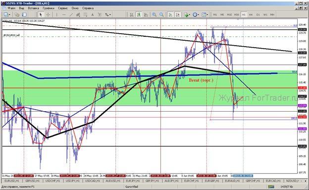 Котировки контрактов на эталонную нефть марки Brent в период торгов второго квартала, относительно показателя среднего уровня сделок, формируются в боковом диапазоне ниже области уровней 116,50-117. Учитывая общую тенденцию всех мировых рынков, связанную с отсутствием объективных факторов для формирования нового роста, котировки нефтяных контрактов на смесь марки Brent в диапазоне уровней 110-115 склонны к снижению в область уровня 110 и ниже него до конца торгов в июне.