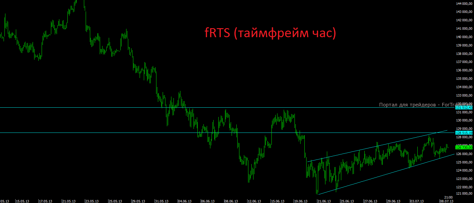 Фьючерс на индекс РТС так и продолжает медленно ползти в своём растущем канале. Ближайшим сопротивлением будет выступать диапазон 128500-129000 пунктов. Пробой и закрытие дня ниже отметки 125000 будет свидетельствовать о сломе позитивных настроений.