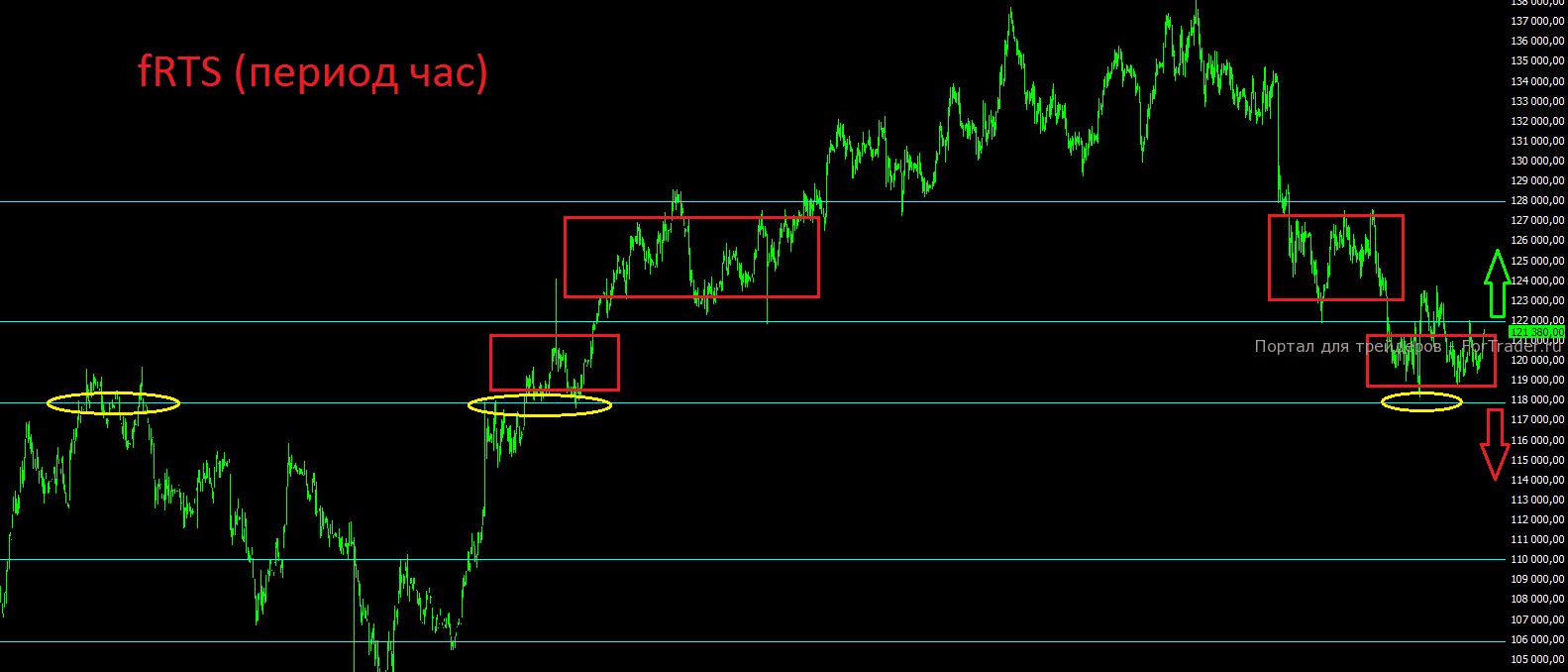 По фьючерсу на индекс РТС за последние три торговых дня картина также сильно не изменилась. Мы продолжаем наблюдать проторговку в новом ценовом диапазоне с границами 118000-122000 пунктов. Пока день не закрылся за пределами границ диапазона, можно работать на отбой от этих самых границ, но как только, по итогам дня, цене удастся выйти из диапазона, то работать нужно будет уже только в сторону выхода. На прошлой неделе мы уже дважды видели пробой и выход цены выше отметки 122000, но закрытие дня происходило ниже этой отметки.