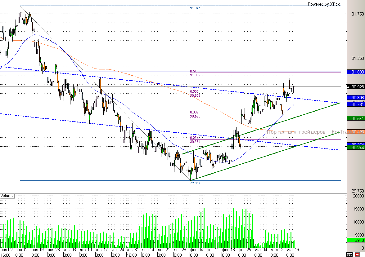 Тем временем после того как на вчерашних торгах пара доллар/рубль нащупала поддержку на отметке 30,8, сегодня она вновь устремилась покорять 31. Ближайшей целью для роста доллара после пробоя 31 может стать отметка 31,1, ведь именно там сейчас находится 61,8% коррекции по Фибоначчи к волне снижения. В противном случае, рубль, пробив 30,8, уйдет в район 30,6.