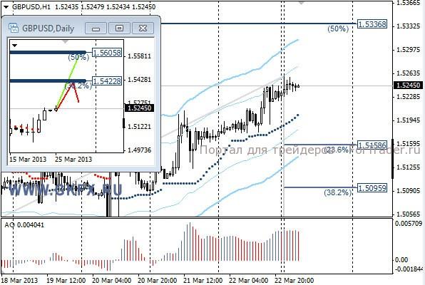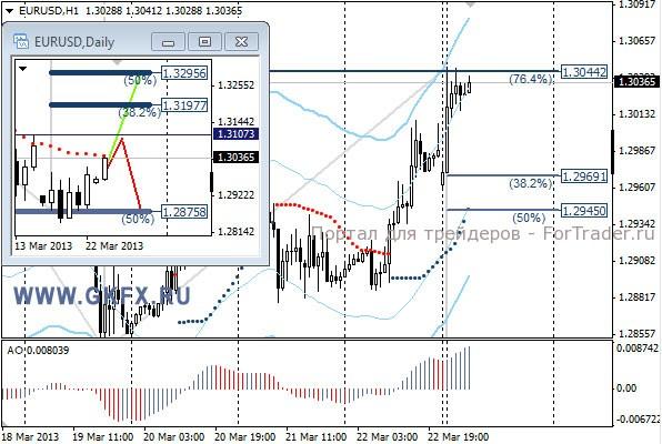 Пара EURUSD все же выросла на ожиданиях благополучного разрешения ситуации с Кипром. Даже слабые данные Ifo ненадолго сменили динамику. Сегодня утром стало известно, что Кипр договорился с тройкой. Разовый сбор будет браться с депозитов выше 100 тысяч евро. По пятничной рекомендации сделка сработала, возможность поставить безубыток была, в итоге он и сработал. Предположительное движение цены на прошлой неделе на дневном графике не совпало. На этой неделе рассматриваю традиционно два варианта возможного движения цены, основной красный и альтернативный зеленый, склоняюсь к красному. Значимые уровни на сегодня отмечены на часовом графике. Индикатор АО в положительной зоне и растет, указывая на желание пары двигаться вверх. Индикатор тренда указывает на рост. Сегодня наблюдаем за предпочтениями рынка.