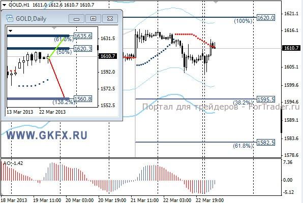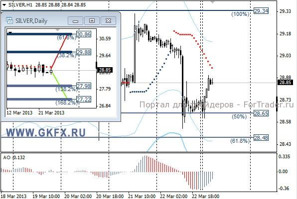 Цены на золото корректировались, прервав рост в связи с оптимистичными настроениями по поводу ситуации на Кипре. Целевая отметка 1620,0 достигнута не была. Возможно, еще будет рывок наверх на этой неделе. Предположительное движение цены на прошлой неделе на дневном графике частично совпало. На дневном графике традиционно делаю два варианта движения цены на неделю, основной красный и альтернативный зеленый, склоняюсь к красному. Значимые уровни на сегодня отмечены на часовом графике. Индикатор АО в отрицательной зоне и растет, указывая на коррекцию перед возможным продолжением снижения. Индикатор тренда указывает на снижение. Сегодня наблюдаем за предпочтениями рынка.