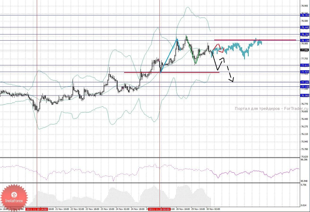 По паре Доллар/Йена ключевыми уровнями являются: 78.70, 78.44, 78.29, 78.15, 77.61, 77.47, 77.24, 77.15 и 76.96. Здесь формируется небольшой потенциал для нисходящего движения, что поддерживает общие настроения на рынке, однако нам также интересна локальная восходящая структура от 28 ноября, развитие которой можно ожидать после пробоя 78.29, в данном случае цель 78.44, возле этого уровня консолидация цены. Пробой уровня 78.44 должен сопровождаться выраженным восходящим движением к потенциальной цели – 78.70. Краткосрочное нисходящее движение ожидаем после пробоя 77.61, здесь цель 77.47, в этом диапазоне консолидация, пробой последнего значения должен сопровождаться импульсивным движением к уровню 77.24. В коридоре 77.24 – 77.15 консолидация цены. Потенциальным значением для низа считаем уровень 76.96, движение к которому ожидаем после пробоя 77.15.