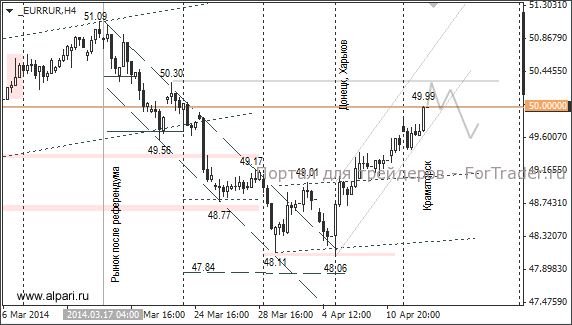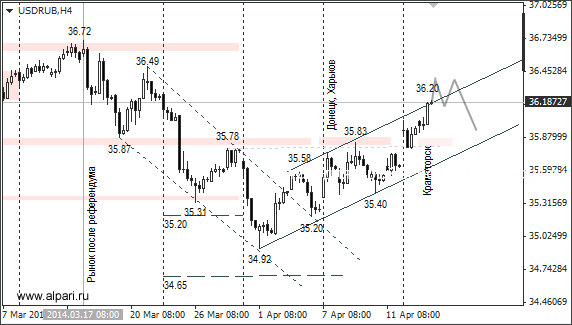 Пока ситуация в восточных областях Украины не стабилизируется, в парах с рублем сохранится повышенная волатильность. По формирующимся ценовым паттернам на четырёхчасовом тайм-фрейме пар доллар/рубль и евро/рубль можно предположить, что в среду с открытия валютного рынка курсы доллара и единой валюты отвоюют у рубля ещё по 30 копеек. Уровни 36,40 для доллара и 50,30 для евро выступят сопротивлениями, от которых можно ожидать краткосрочной коррекции.