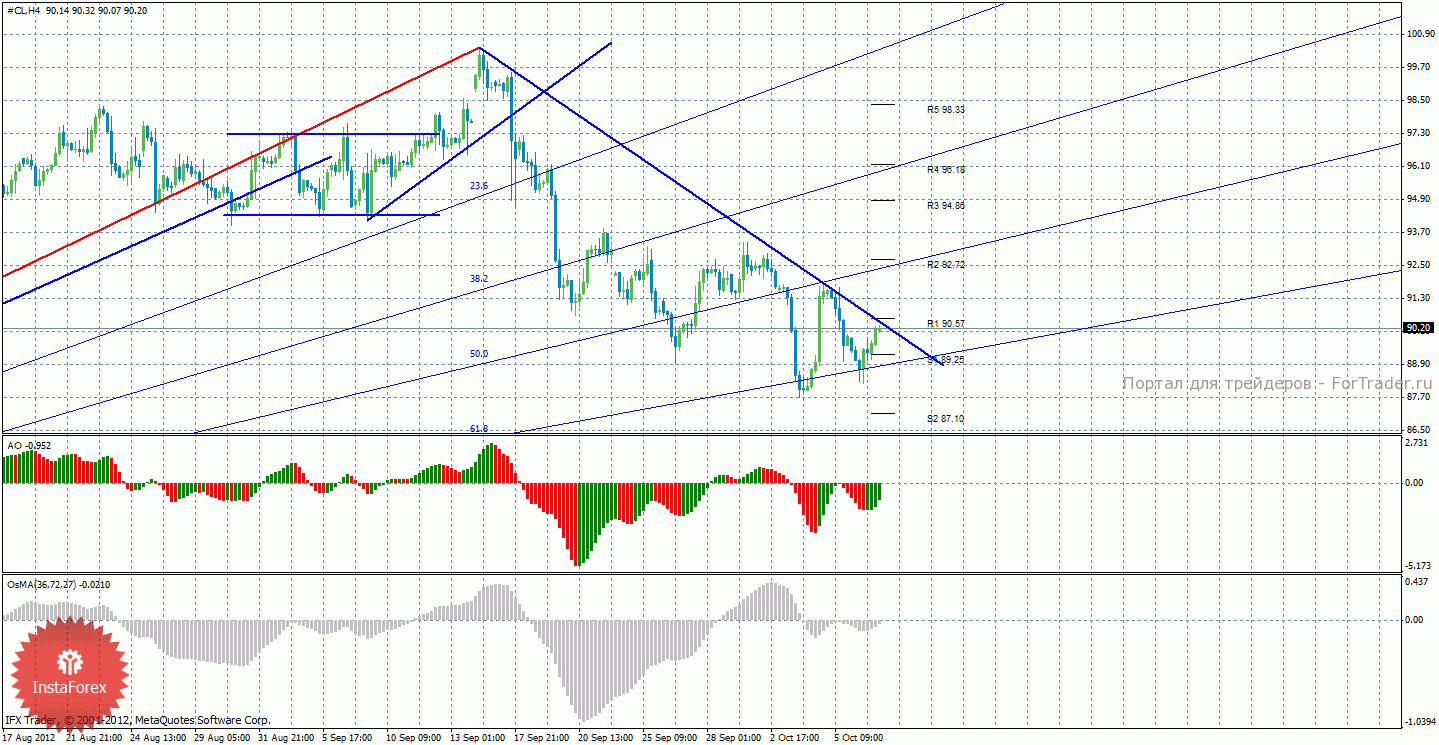 Анализ сырой нефти за 9 октября показывает, что нисходящее движение сохраняет свои перспективы, а нисходящая линия тренда перестроена и теперь имеет меньший угол наклона. Нисходящая линия тренда поддерживает торгующих на понижение, выше нее можно размещать стоп-лосс, а закрепление выше нее цены будет означать смену тенденции. Нисходящее движение может продолжиться с целями 87,10 и 84,96, но только в случае закрепления ниже уровня S1 — 89,25. Если же цена закрепиться выше линии тренда, то может начаться восходящее движение с целями 92,72 и 94,86. Индикатор Awesome показывает текущее восходящее движение, так как последний закрытый бар зеленого цвета. OsMA также направлен наверх, что говорит о восходящем характере движения и в более долгосрочном плане.