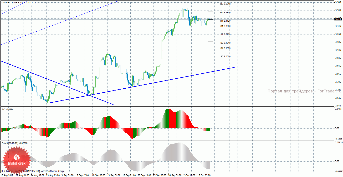 Анализ природного газа за 9 октября показывает, что цена продолжает корректироваться, сохраняя перспективы возобновления восходящего движения. Целями для продолжения восходящего движения сейчас выступают 3,4960 и 3,5810, но для этого требуется закрепление цены выше уровня 3,4120. Закрепление цены ниже уровня S1 – 3,3600 укажет на возможное продолжение коррекции с целями 3,2760 и 3,1910. Новая восходящая линия тренда поддерживает торгующих на повышение, но у нее достаточно малый угол наклона и цена довольно далеко от нее находится, хотя и слабой ее назвать нельзя. Индикатор Awesome показывает локальное восходящее движение, последний закрытый бар окрашен в зеленый цвет. OsMA же направлен вниз, что сигнализирует о нисходящем движении цены на газ в более долгосрочной перспективе.