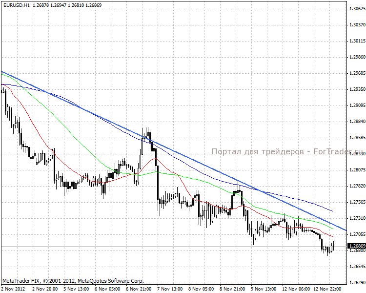 На часовых графиках ситуация аналогичная, цена уже несколько раз отбилась от нисходящей линии тренда. В ближайшее время есть вариант возникновения технического отката в район 1,2780.