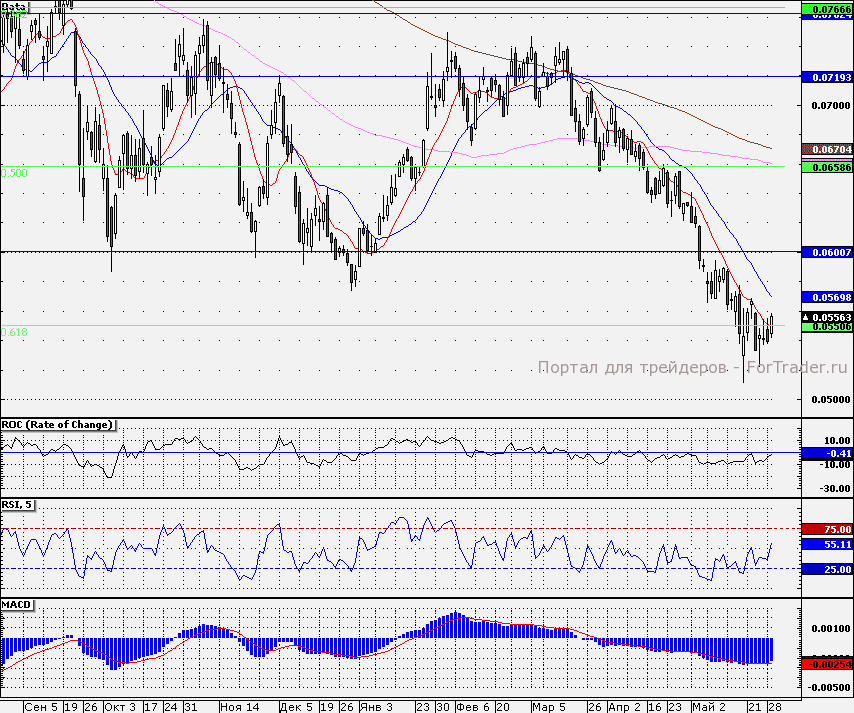 По итогам сессии акциям эмитента удалось закрепиться выше 10-дневной скользящей (5,498 коп.), сдерживавшей бумаги от роста на протяжении довольно длительного времени. Негативный внешний фон может способствовать тестированию данной отметки уже в качестве поддержки. При смене настроений акции эмитента могут вернуться к сопротивлению 5,6 коп., закрепление выше которого поставило бы следующей целью достижение 21-дневной скользящей (5,7 коп.).