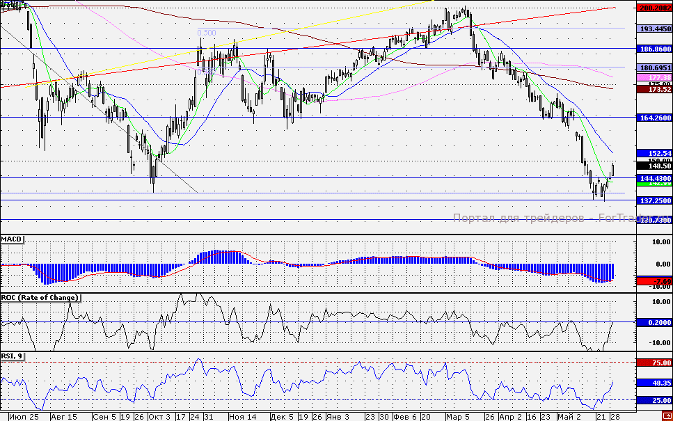 В ходе вчерашней сессии акции эмитента вплотную приближались к значимому уровню сопротивления 150 руб., однако в районе данной отметки инвесторы предпочли зафиксировать прибыль. Сегодня с утра фиксация может быть продолжена. Ближайшей поддержкой является уровень 146 руб. В случае смены настроений бумаги вновь могут нацелиться на 150 руб.