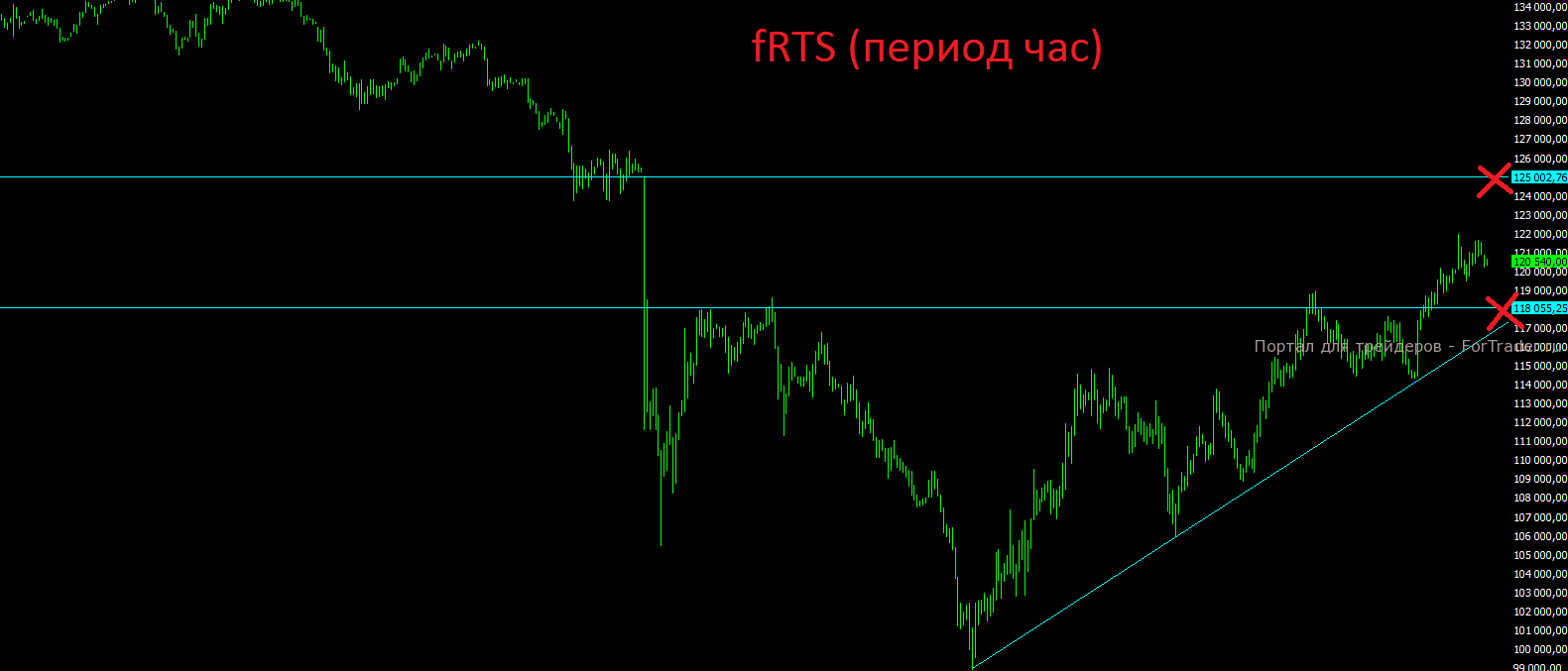 Ну и напоследок рассмотрим техническую картину по фьючерсу на индекс РТС. До сих пор нет даже намёков на коррекцию и цена продолжает чётко находиться в восходящем тренде. Откат пока видится не ниже отметки 118000 пунктов. Потенциальная цель роста до отметки 125000 пока остаётся в силе. Если рассматривать горизонт 2-3-4 недели, то я смело рекомендую на текущих уровнях открывать короткие позиции без плечей. Что же касается ближайших 1-3 дней, то вынос вверх на 1-3% ещё устроить могут запросто.!