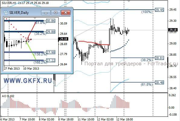 Цены на серебро также как и на золото вышли из диапазона вверх. На дневном графике делаю два варианта движения цены на неделю, основной красный и альтернативный зеленый, склоняюсь к красному. Значимые уровни на сегодня отмечены на часовом графике. Индикатор АО в положительной зоне и снижается, указывая на коррекцию перед возможным дальнейшим ростом. Индикатор тренда указывает на рост. Buy по 29.00 или ниже со стопом 28,85. Цель 29,45.