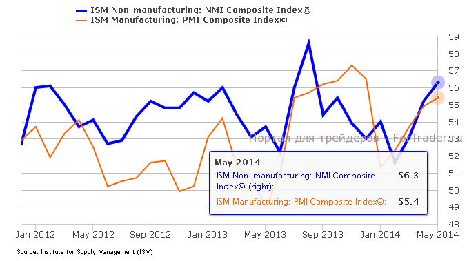 Деловая активность в сфере услуг США продолжила расти третий месяц подряд и достигла в мае максимального уровня с августа 2013 года. Согласно данным Института управления поставками (ISM), индекс деловой активности в сфере услуг США поднялся в мае до 56,3 п. по сравнению с 55,2 п. в апреле, превзойдя ожидания роста до 55,5 п. Больше всего выросли в мае подындексы портфеля заказов, новых заказов, производства и занятости. Данные от Markit также указали на ускорение роста активности в сфере услуг США в мае до самого высокого уровня с марта 2012 года. Согласно данным Бежевой книги ФРС, экономическая активность выросла в последние недели во всех регионах США, чему способствовало повышение потребительских расходов.